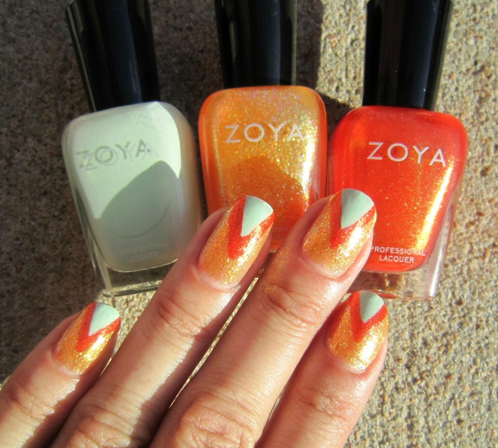 This manicure was inspired by the always amazing Pshiiit. I love her photos and nail art especially her nail art inspired by fashion like this fantastic post. I finally got around to do a version of this manicure. It's super simple but I never thought about orienting the triangles this way & I like the results. I used Zoya Alma for my base color & then added a triangle of Zoya Amy & finished with a smaller triangle in Zoya Neely.
